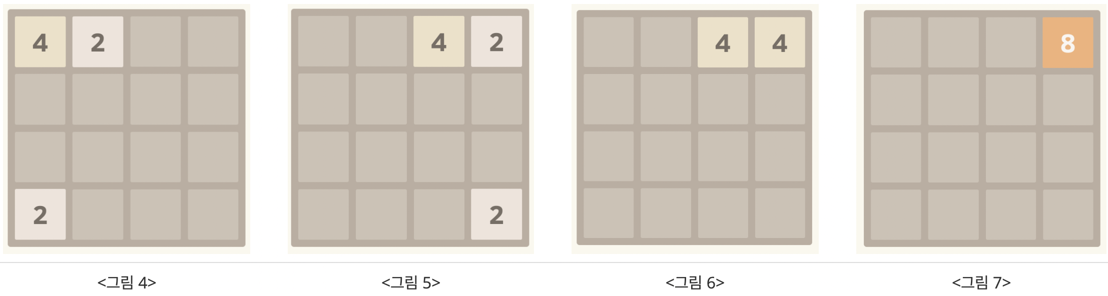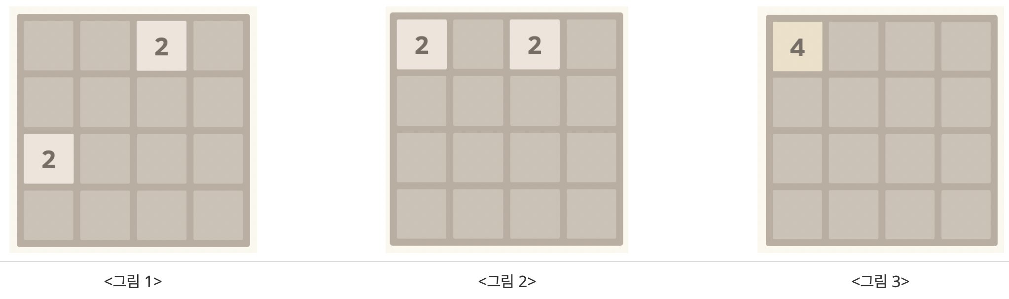 <그림 1>의 경우에서 위로 블록을 이동시키면 <그림 2>의 상태가 된다. 여기서, 왼쪽으로 블록을 이동시키면 <그림 3>의 상태가 된다.