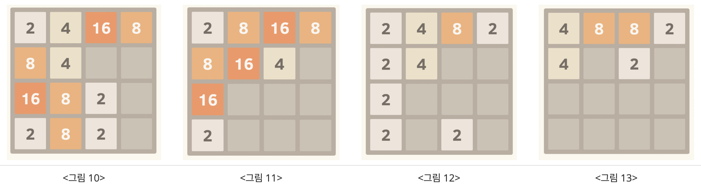 <그림 12>의 경우에 위로 블록을 이동시키면 <그림 13>의 상태가 되는데, 그 이유는 한 번의 이동에서 이미 합쳐진 블록은 또 합쳐질 수 없기 때문이다.