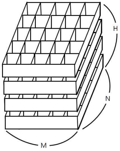 첫 줄에는 상자의 크기를 나타내는 두 정수 M,N과 쌓아올려지는 상자의 수를 나타내는 H가 주어진다. M은 상자의 가로 칸의 수, N은 상자의 세로 칸의 수를 나타낸다. 단, 2 ≤ M ≤ 100, 2 ≤ N ≤ 100,